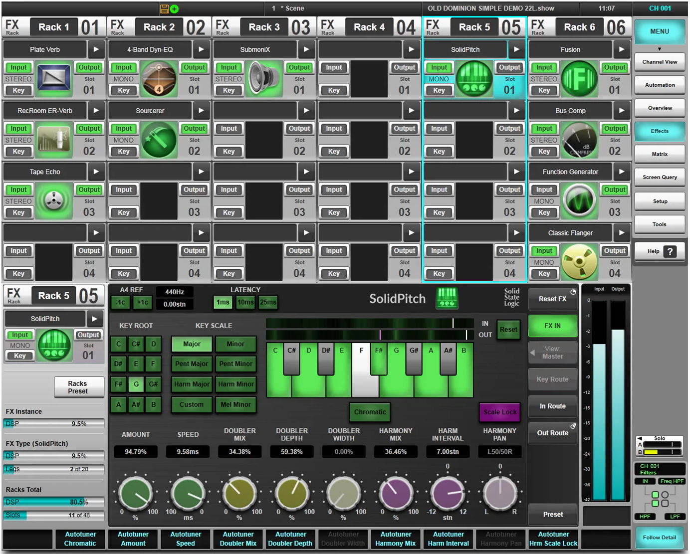 SolidPitch is a new onboard vocal tuning effect designed for everything from gentle pitch correction to over-the-top, modern, pop vocal effects, but it also contains powerful processing capabilities for doubling and harmonisation alongside tuning, making it a highly versatile and creative effect for live production. The Doubler effect sums two copies of the tuned signal before sending it to the output, which can be detuned and delayed to create an impression of greater thickness, or increased width when a stereo path is used. The amount of doubling is controlled with the Mix parameter, which controls the balance of the single tuned signal and the effected copies. Detune and Delay effects can be applied within the Depth parameter. In stereo configurations, the Width parameter pans the two doubled copies to the left and right respectively.