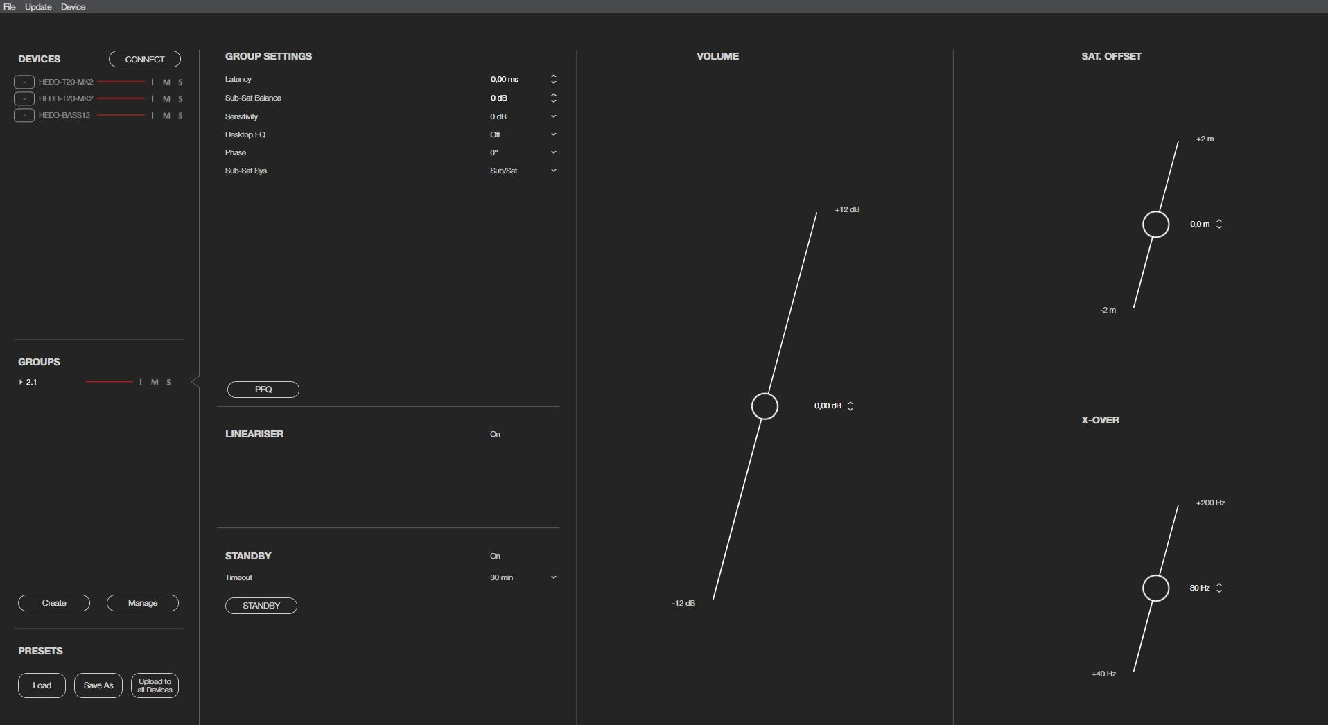 - Flexible group creation for stereo, Sub-Sat (2.1), or immersive setups