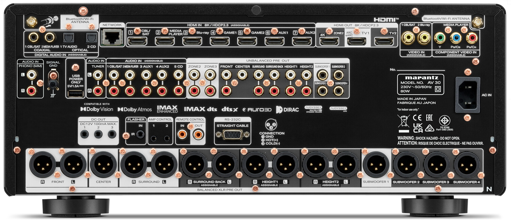 Der neue AV 30 setzt auf den neuesten und leistungsstärksten Dual-Core-SHARC-DSP-Chipsatz von Analog Devices in Kombination mit hochwertigen 32-Bit-D/A-Wandlern. Das Ergebnis ist eine leistungsstarke digitale Plattform, die alle Formen eingehender Audiosignale präzise dekodieren und genau verarbeiten kann – von hochauflösendem Stereo bis hin zu den neuesten immersiven Klangformaten wie Dolby Atmos, IMAX Enhanced, DTS:X und AURO-3D.