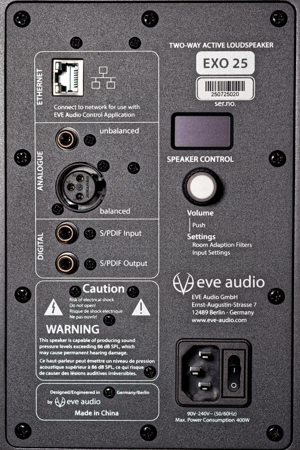 Im Gegensatz zu früheren Modellen kann der EVE Audio EXO25 mit einer sich aktuell noch in Vorbereitung/Finalisierung befindlichen eigenen Raumkorrektur- und Remote-Software des Herstellers genutzt werden, für die die Nahfeldmonitore über die integrierte Ethernet-Schnittstelle auf der Rückseite für Kalibrierungswecke oder Firmware-Updates an einen Host-Rechner angebunden werden. Dante oder Audio-via-IP stehen nicht zur Verfügung und sind auch nicht vorgesehen, da es sich hierbei konzeptionell um einen reinen Control-Port handelt. Neben unsymmetrischen und symmetrischen analogen Eingängen befindet sich auch ein digitaler S/PDIF-Eingang auf der Rückseite.