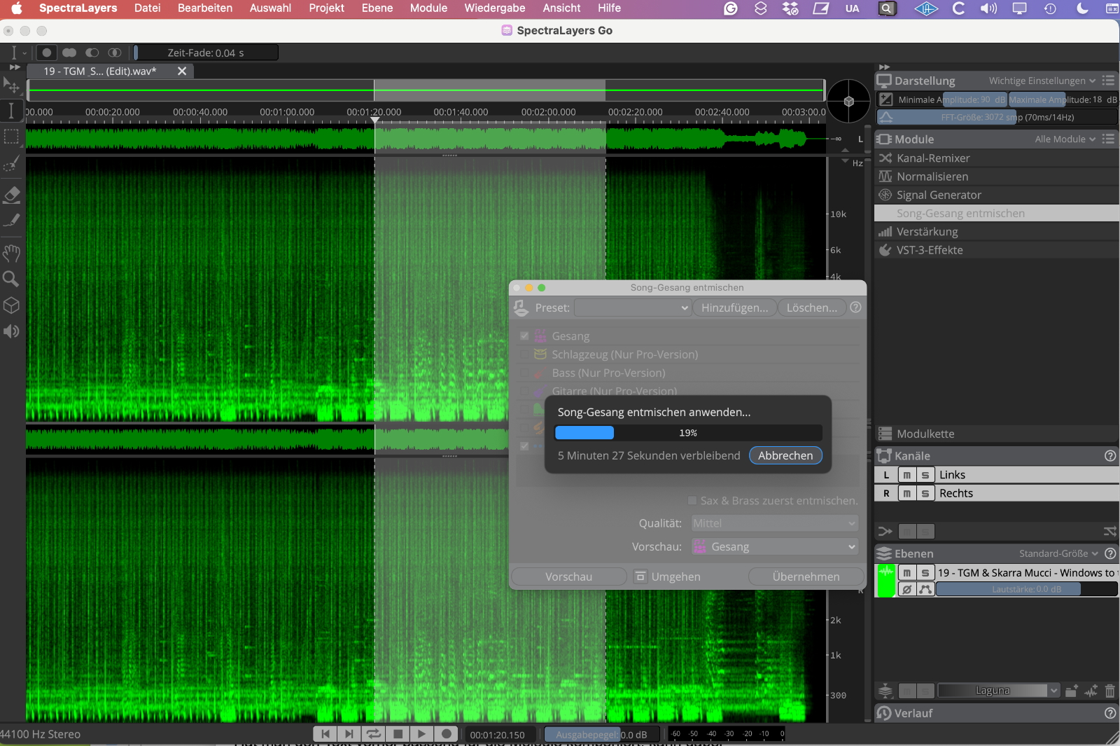 Der Prozess via Spectralayers Go benötigt mehr Zeit, bietet dafür mehr Optionen und eine bessere Qualität. Die neue mitgelieferte Spectralayers Go 12-Version lässt sich auch Standalone nutzen und beherrscht Vocal-Unmixing in verschiedenen Qualitätsstufen, die allesamt bereits besser klingen als die Separierung in Cubase. Für den vollen Funktionsumfang in Bezug auf „Song unmixing“ ist in Spectralayers aber ein Update auf die Pro-Version notwendig. Grundsätzlich bietet Spectralayers 12 gegenüber Version 11 verbesserte Algorithmen bei der Bearbeitung auf der Basis von Spektralanalyse, verbesserte Auswahlwerkzeuge und optimierte Performance. Etwas irritiert hat mich, dass vor der Installation der Version 12 die höchste Vocal-Unmixing-Qualität in Version Go 11 „Extreme“ hieß, danach in Version 12 aber nur noch „High“, wie die mittlere Qualitätseinstellung aus Version 11 zuvor, wobei Version 12 temporär über 8 GB Arbeitsspeicher in Anspruch nahm, aber immerhin die verbleibende Restzeit zeigte.