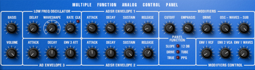 Die Sektion mit den Reglern ist identisch mit denen des Hardware-Vorbild und die Bedeutung ist durch die Beschriftung ist eigentlich selbsterklärend. Ganz links sind die Regfler für Lautstärke und Stereoeffekt, dann drei für den LFO-Regler für die drei Hüllkurvengeneratoren, ganz rechts drei Regler für den Hüllkurven-Modulationsgrad (MODOFIERS CONTROL) und darüber Regler für Filter, Drive-Effekt und Oszillator-Pegel.